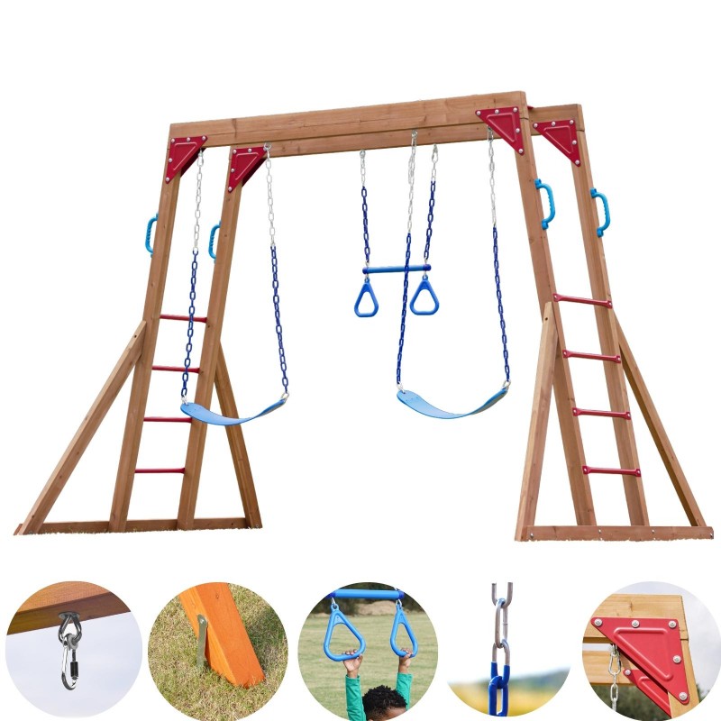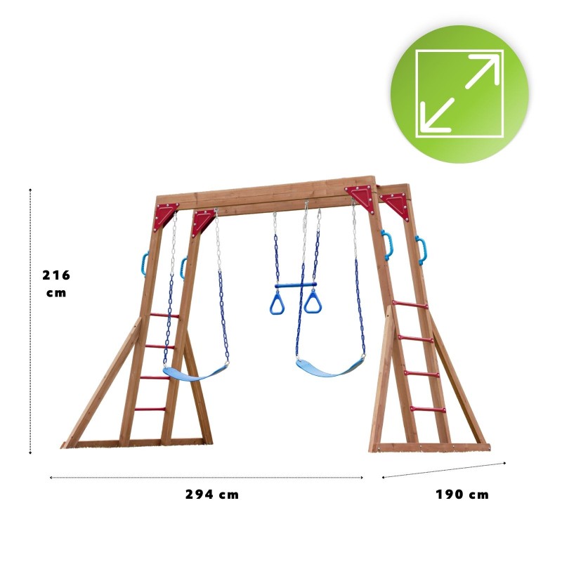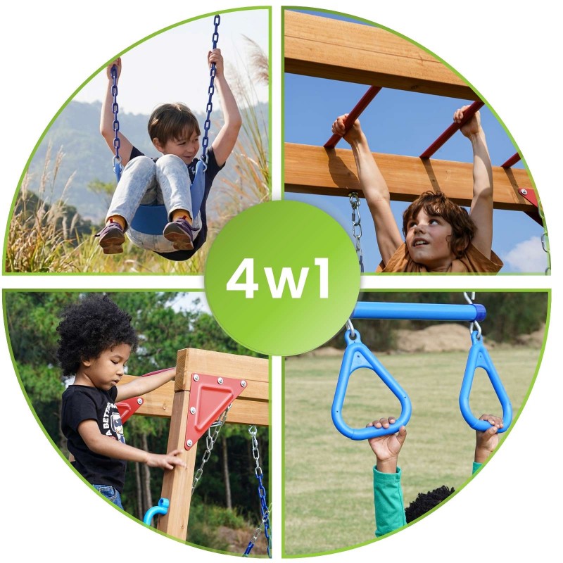 - Obsah sady: 2 houpačky + gymnastický trapéz + opičí dráha + žebřík