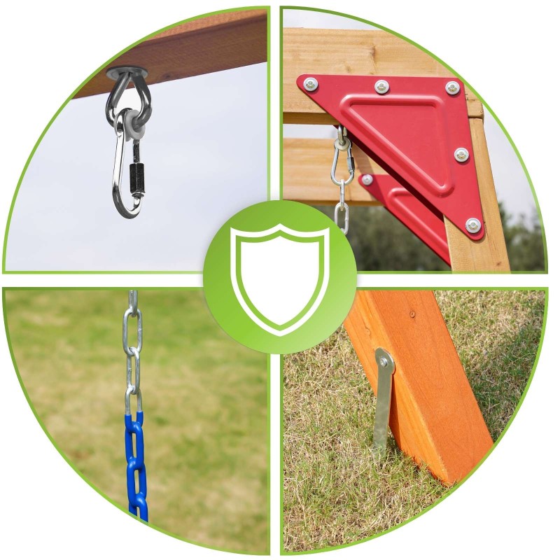 ✅ Houpačky upevněné na pevných řetězech obalených PVC – jsou příjemnější a bezpečnější na uchopení a pohodlnější pro dětské ruce.